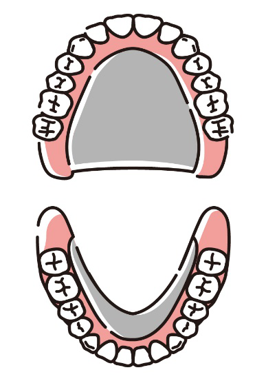 ⻭が⼀本もなくなってしまったら、総⼊れ⻭を⼊れることになります。保険治療の場合は、プラスチック製の総⼊れ⻭しかありませんが、保険外(⾃費)の総⼊れ⻭にはいろいろなタイプがあります。あごの⾻の状態が良ければ、インプラント治療や、インプラント義⻭(⼊れ⻭)治療ができる場合もあります。